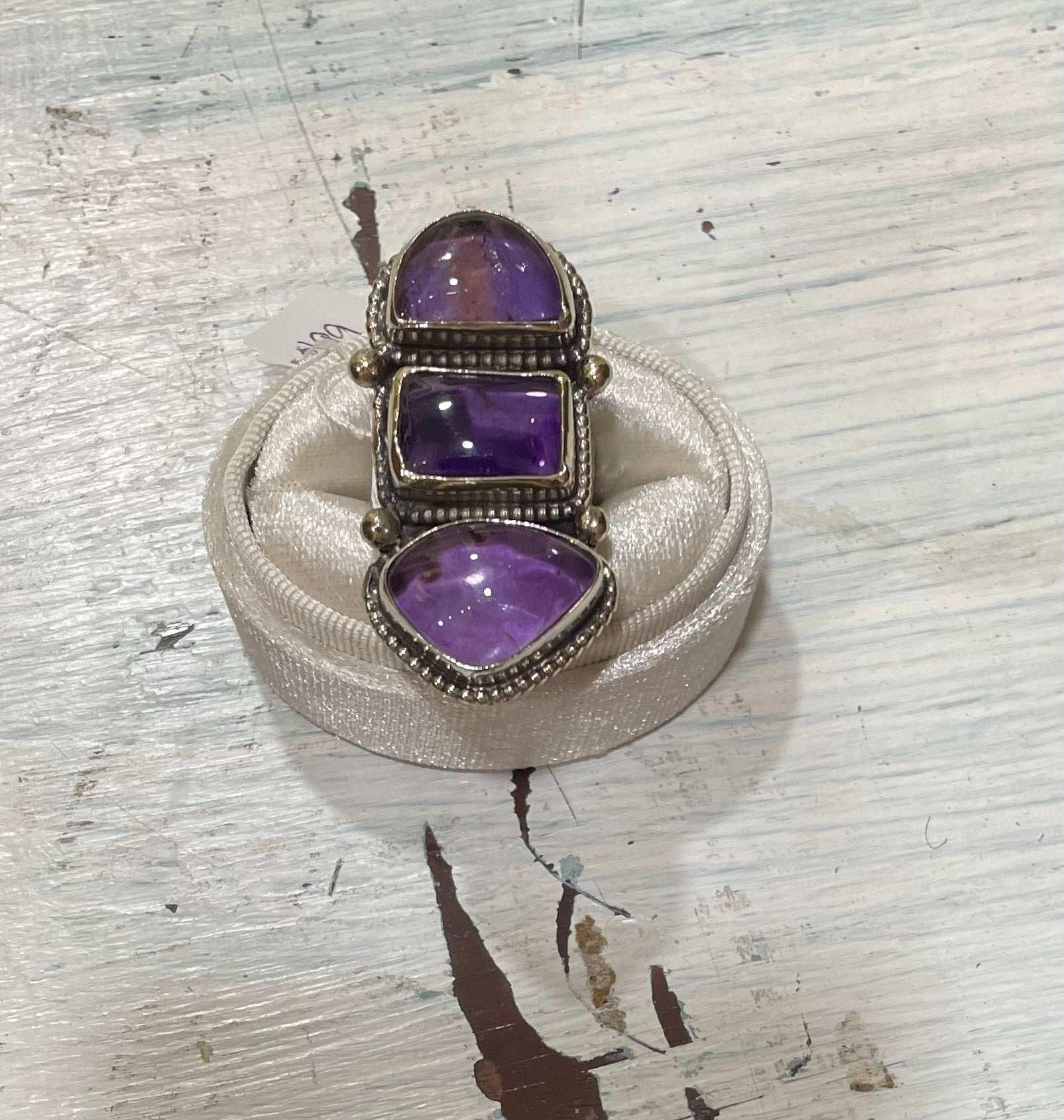Tara’s exquisite Amethyst ring features 3 tiered cut amethyst set in ornate silver and is finished all around the ring.