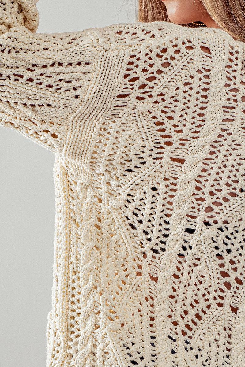 The Cable Knit Button Down Cardigan by Aaron and Amber is a timeless piece made with luxurious crochet material. This cream-colored v-neck cardigan features long sleeves and a classic button-down design for a sophisticated look. Perfect for any occasion, this timeless piece is sure to become a wardrobe staple.