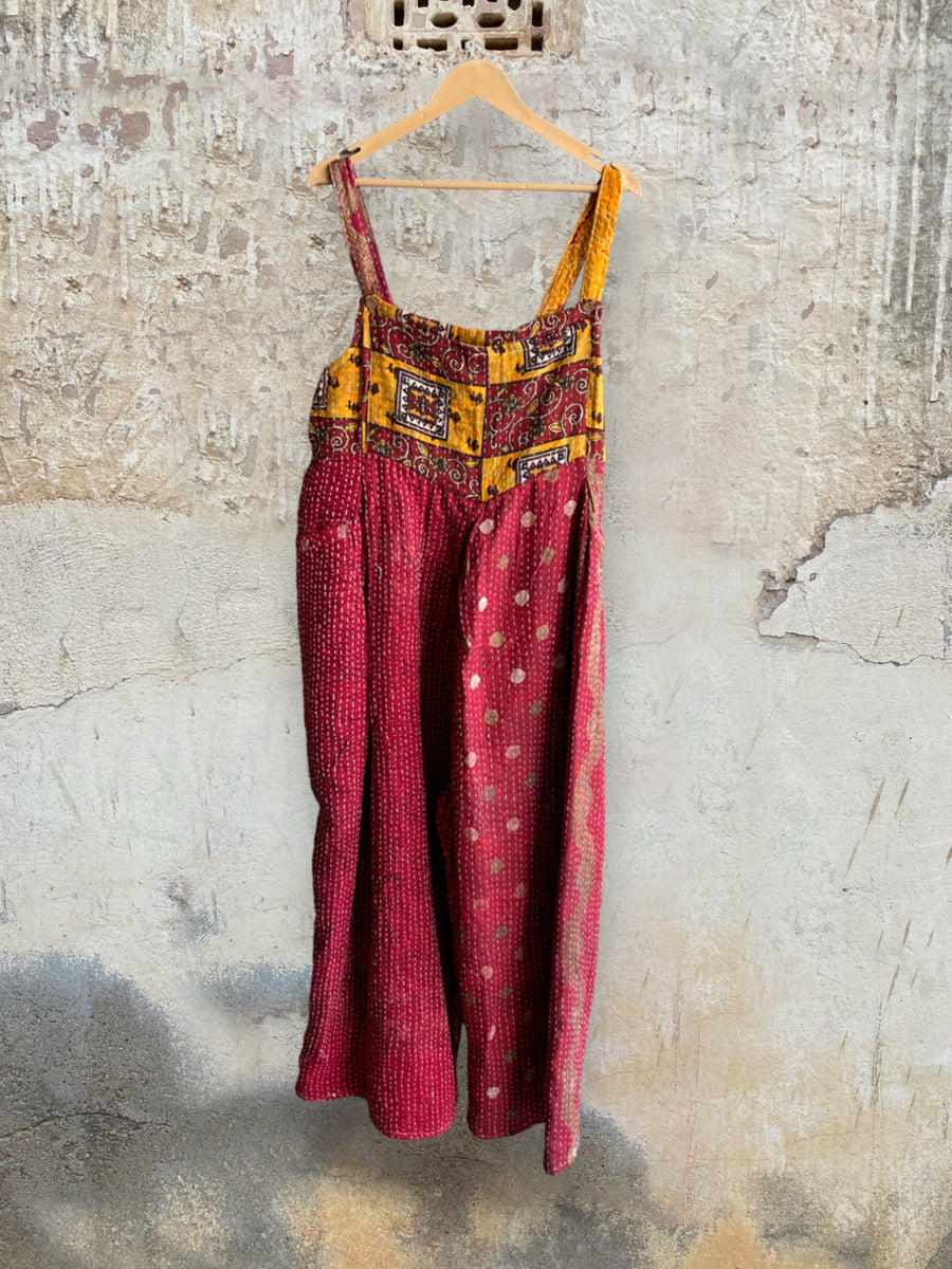 We took the classic overall dress silhouette and funked it up in Kantha. Features adjustable button straps, deep interior pockets, front bib pocket and wide flowy legs. Elastic in the back and a tieback feature allows this style to fit a wide range of sizes.