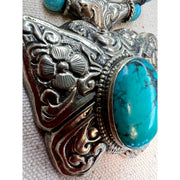 This enchanting butterfly necklace brings a touch of whimsy to any outfit! Crafted from ornate Tibetan silver, it features a stunning turquoise center stone surrounded by complementary turquoise and silver beads, all hand-strung with care. The intricate detailing and natural beauty of the turquoise make this piece a conversation starter that celebrates both artistry and nature's charm. Perfect for adding personality to your everyday look or layering with other favorites.