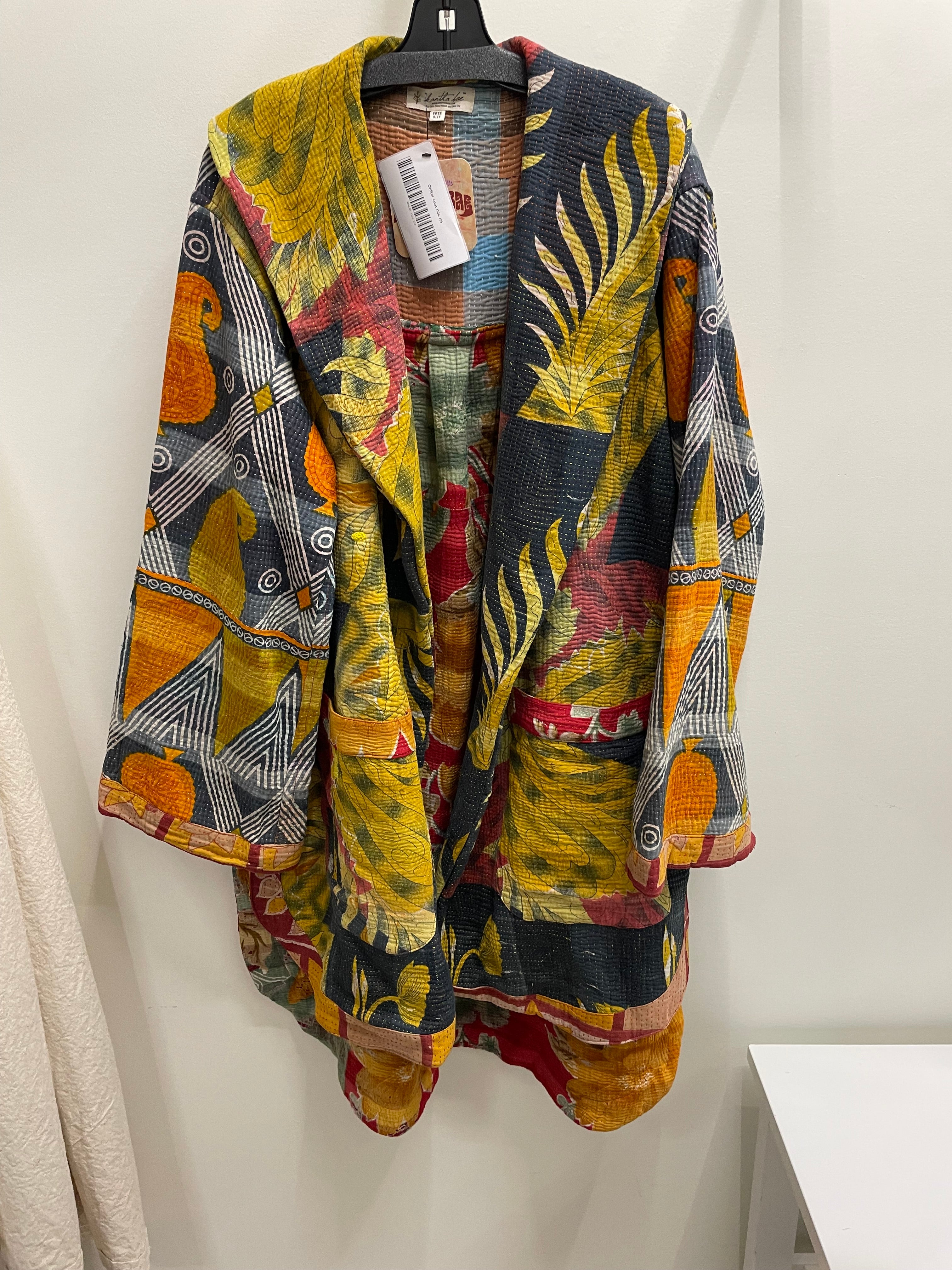 Made from vintage embroidered fine kantha embroidered cotton sari this coat features an shawl collar and deep exterior pockets.