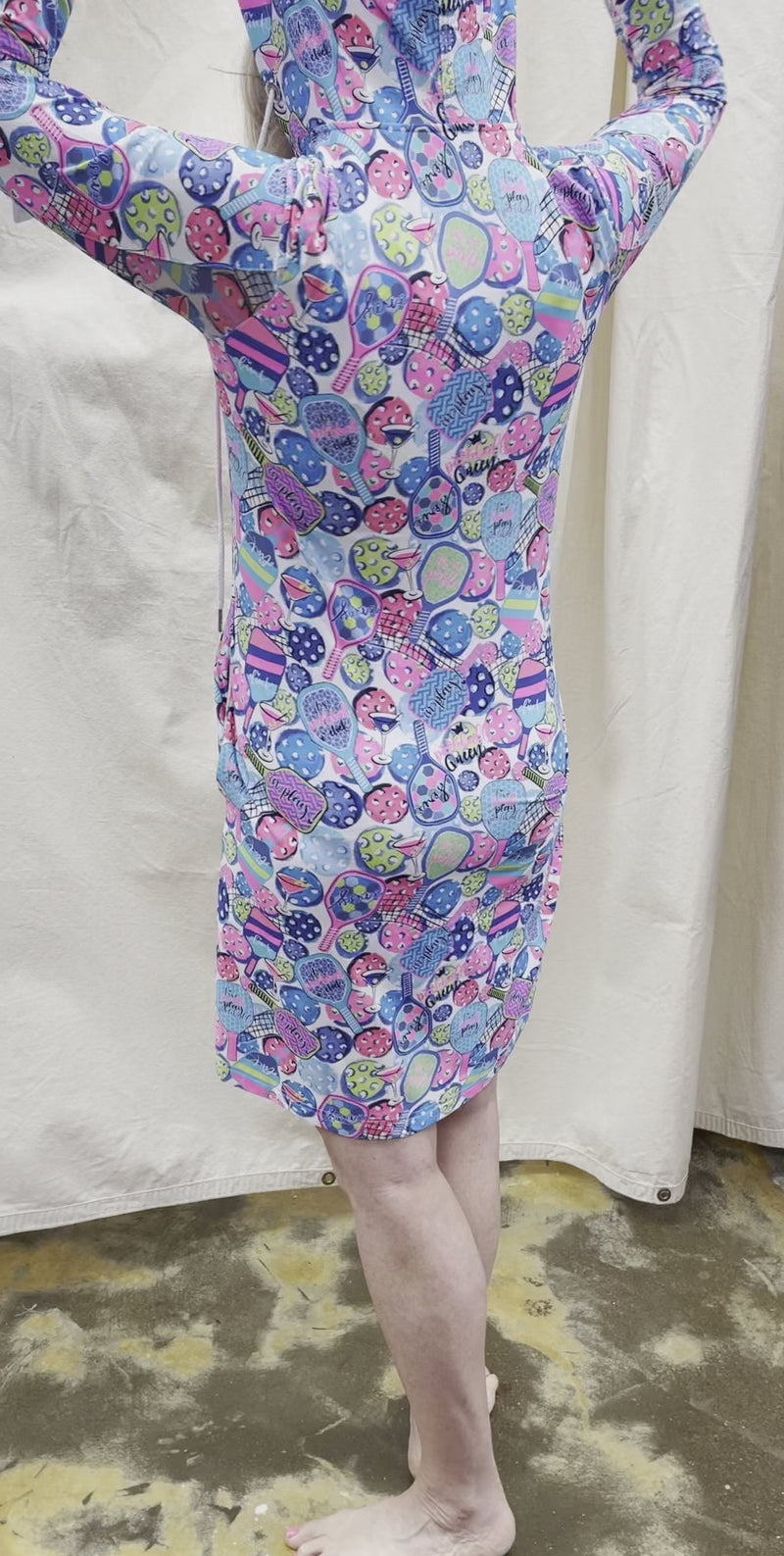 SPF50 sunscreened fabric. Dress has a hood and button front. Super comfy in adorable tennis/pickleball print.